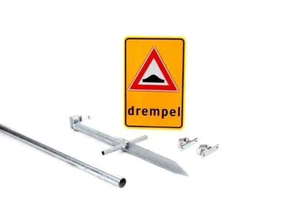 Een slangbrug is een obstakel op de openbare weg. Om weggebruikers te waarschuwen kan gebruik worden gemaakt van waarschuwingsborden. Deze complete set bestaat uit een speciaal waarschuwingsbord “drempel” van 60 x 40 cm, een buispaal van 3 meter, klemmen en een grondpot.