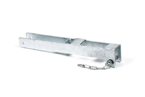 Met een overslagbeugel kunnen twee landhekken aan elkaar worden vergrendeld. Deze overslagbeugel is voorzien van vergrendelpen met ketting.