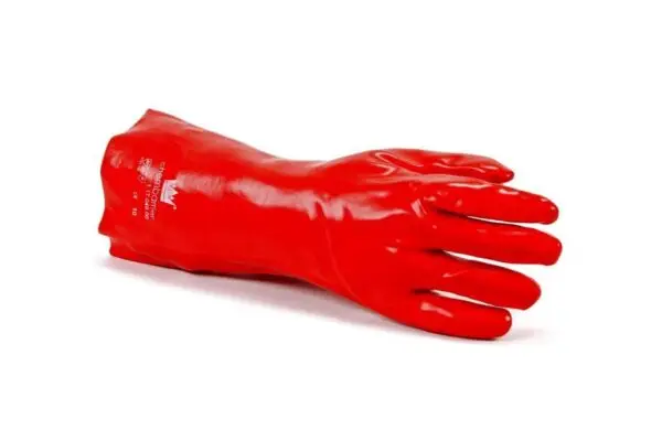 Vloeistofdichte werkhandschoenen met een rode PVC coating.