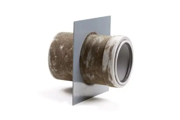 Waterdichte doorvoer voor PVC buis van 50 mm in funderingswand. De muurdoorvoer is aan de buitenzijde bezand voor een optimale hechting aan beton en aan de binnenzijde voorzien van een rubber manchetring.