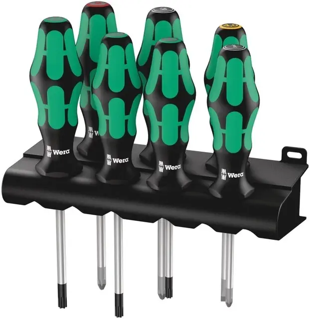7-delige schroevendraaierset met Kraftform-handgreep om prettig en ergonomisch verantwoord te kunnen werken en blaren en schuurplekken te voorkomen. De Lasertip-punt grijpt zich vast in de schroefkop en voorkomt wegglijden. Med v忙rkt酶jsfinderen \\”Take it easy\\”: Farvemarkering efter profiler og st酶rrelsesm忙rkning. Zeskantige wegrolbescherming verhindert telkens wegrollen op de werkplek. Wordt geleverd met handig rack waarin de schroevendraaiers overzichtelijk kunnen worden opgeborgen.